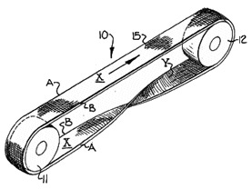 在近代機械工業裡,人們也會運用梅比烏斯之環的特性來設計工件。像是以下這張圖所示的傳送帶,它之所以做成像梅比烏斯之環一樣的形狀,就是為了讓帶子的內外兩面都能充分被利用到。相對於傳統的設計只會讓帶子其中一側不斷被磨損,這樣的設計可以有效延長輸送帶的使用壽命。